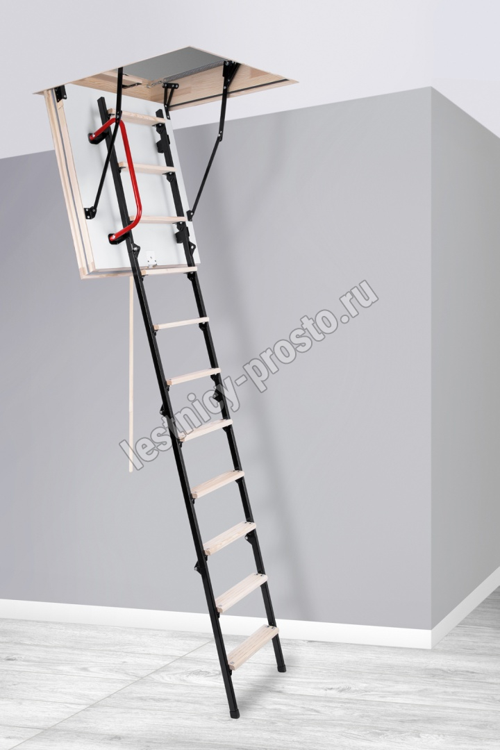 Складная 4-х секционная чердачная лестница. Ступени выполнены из сосны, имеют противоскользящие насечки, направляющие из металла