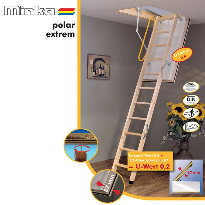 Благодаря «ножничной» системе складывания в сложенном виде лестница LSF очень компактна, и соответственно имеет небольшой размер крышки люка. Специальный механизм регулировки угла открывания крышки люка позволяет подогнать высоту лестницы под высоту потолка.