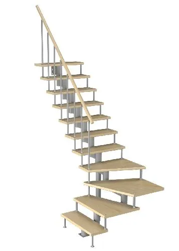 Удобная поворотная лестница на второй этаж. Дополнительные ограждения по первому маршу обеспечивают безопасность при подъеме и спуске, кроме того, небольшой угол подъема открывает всю площадь ступеней. Монтаж осуществляется силами двух человек на объекте по указаниям, приведенным в паспорте на лестницу.