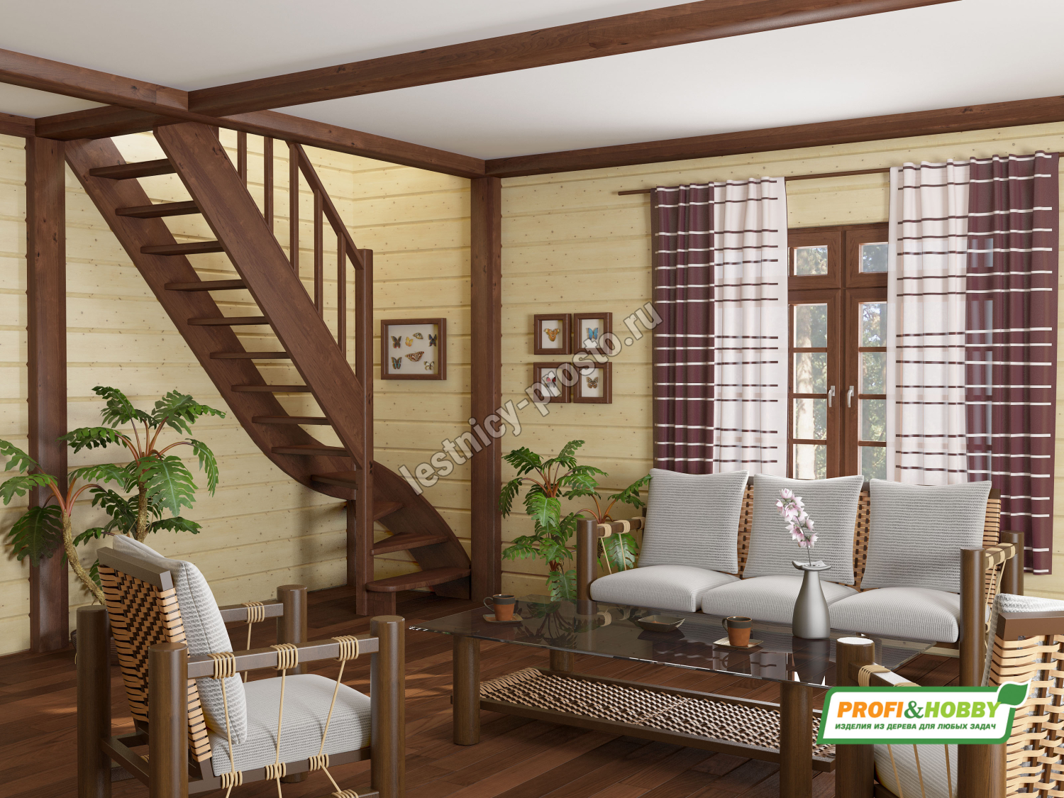 Базовый комплект включает в себя деревянные элементы лестницы и ограждения без какого-либо покрытия.