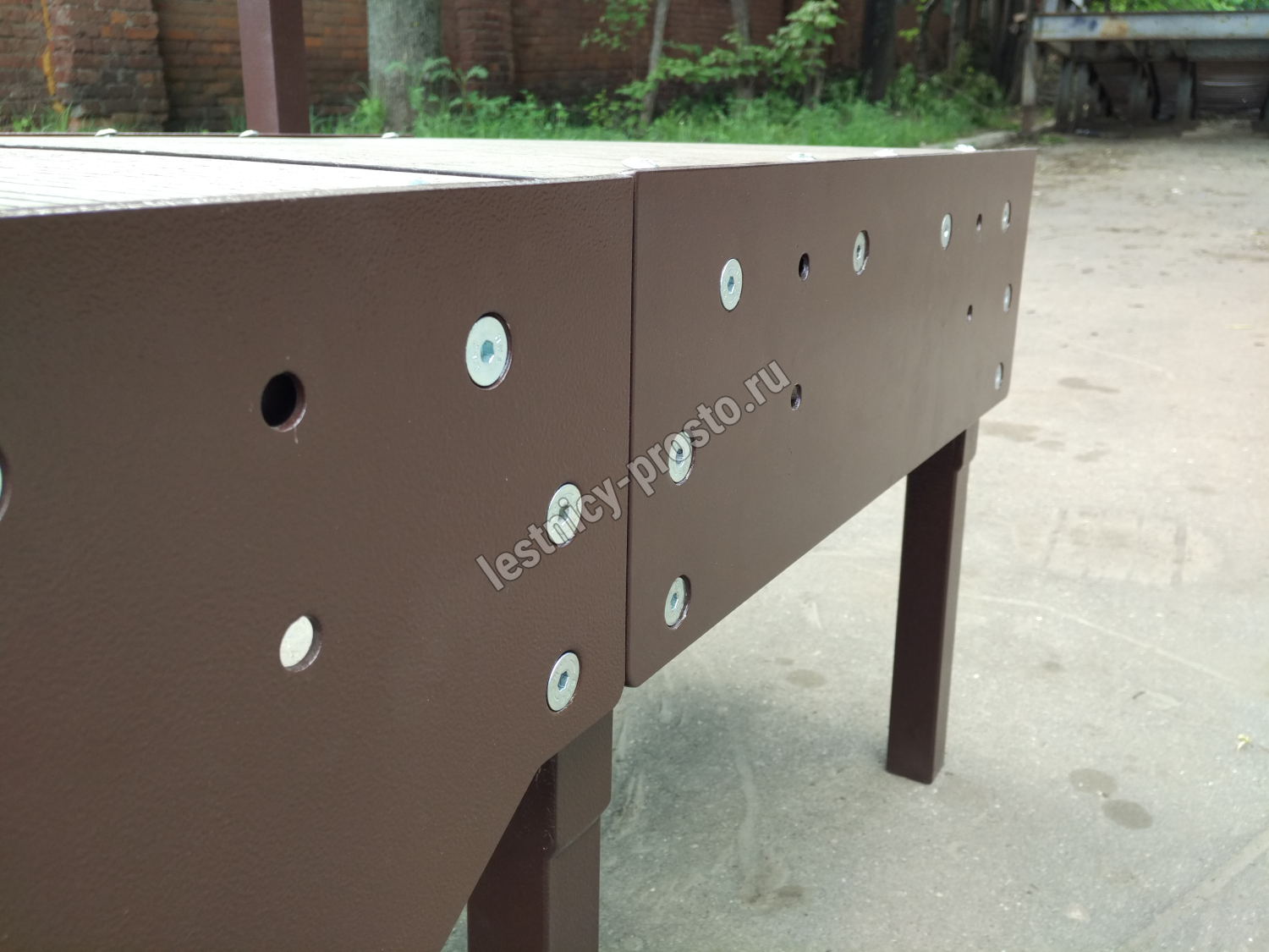Ступени лестницы состоят из металлической рамки, обеспечивающей необходимую прочность, и покрытия из террасной доски ДПК (древесно-полимерный композит). Ступени не боятся воды и мороза, не теряют со временем свой внешний вид и не требуют ухода.