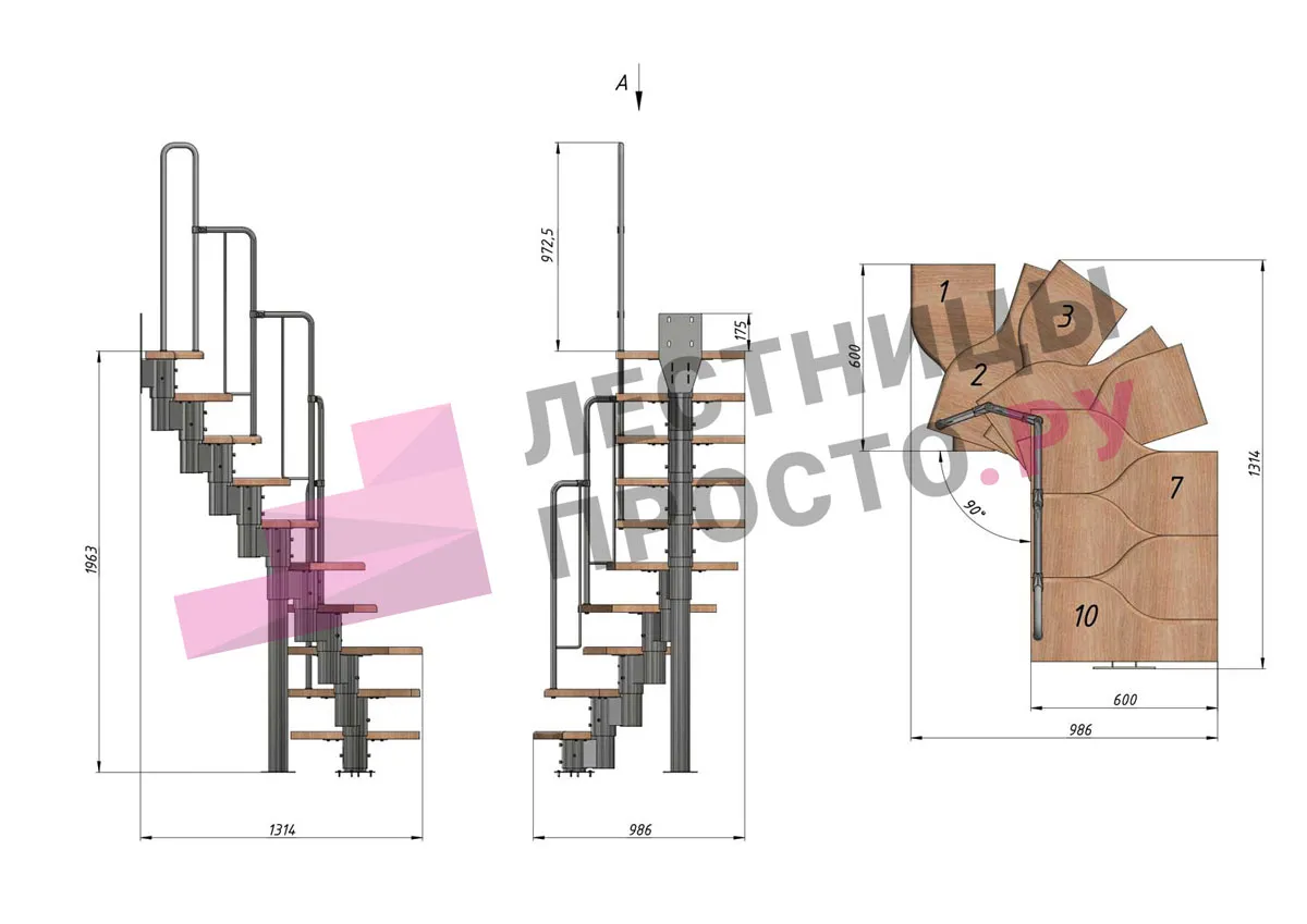Лестница Prosto Urban Black гусиный шаг 600 мм, h180-264 см (10 ступеней), бук