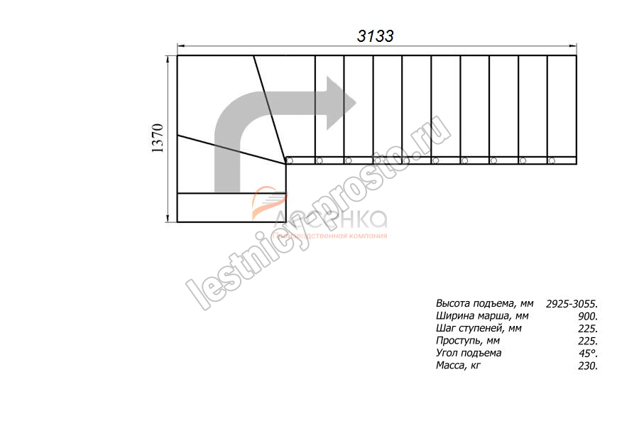 Модульная лестница Фаворит 225 2925-3055, Белый, Лиственница, Крашеная