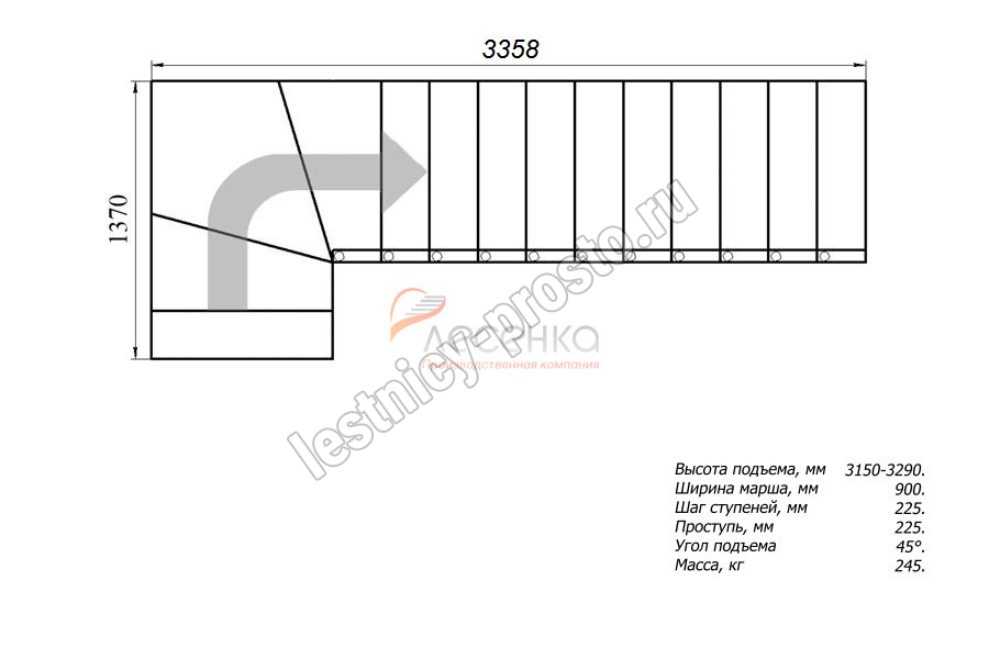 Модульная лестница Фаворит 225 3150-3290, Серый, Лиственница, Нержавеющая сталь