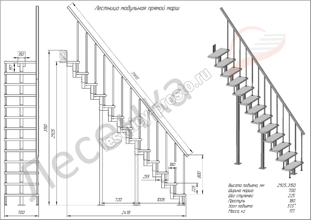 Модульная малогабаритная лестница Линия 2925-3150, Черный, Сосна, Нержавеющая сталь