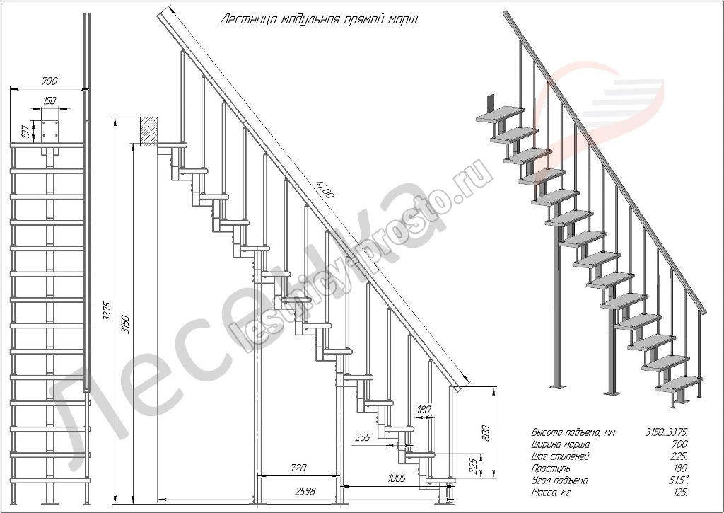Модульная малогабаритная лестница Линия 3150-3375, Серый, Сосна, Нержавеющая сталь