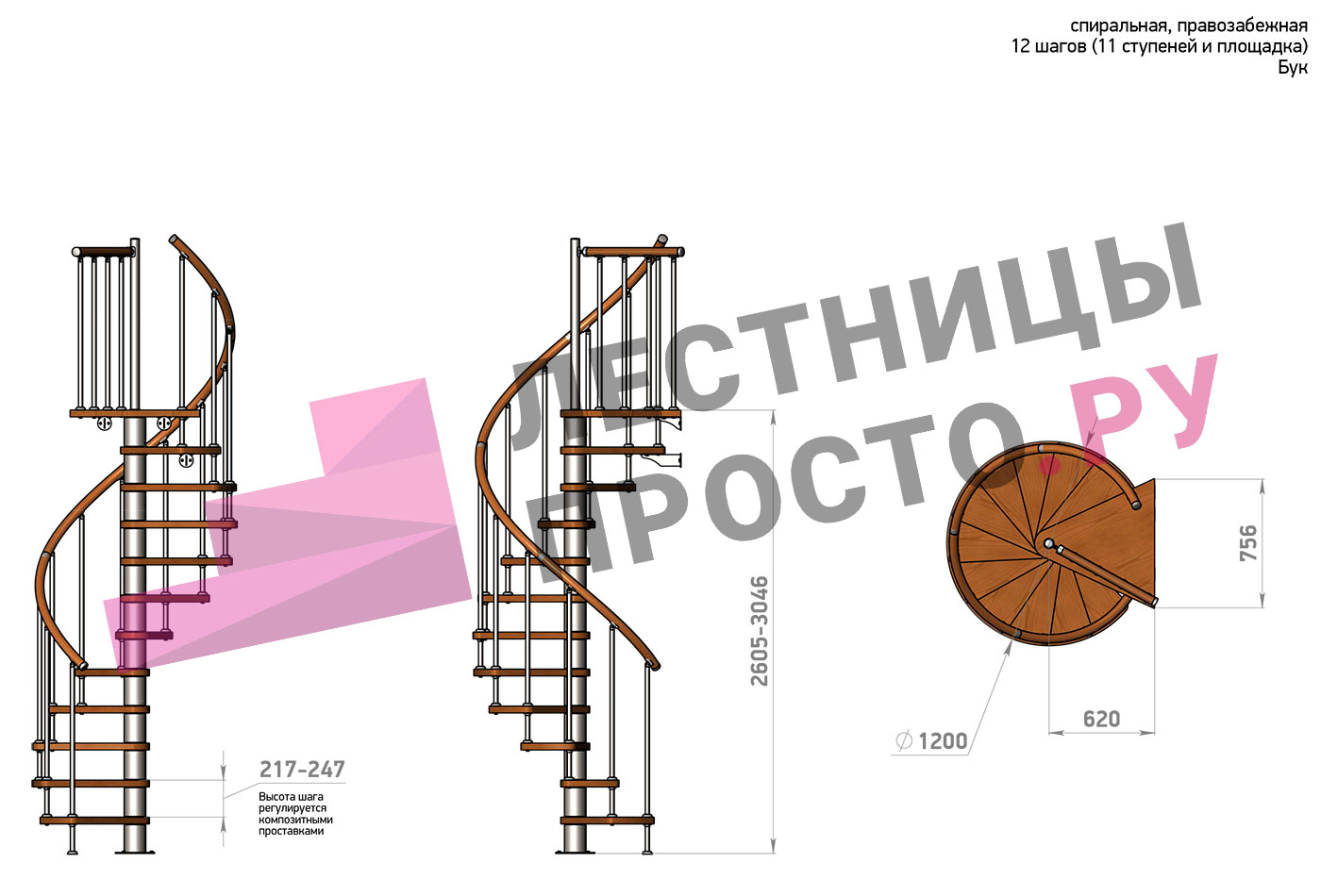 Высота ступеней регулируется с шагом 3 мм. в пределах 217-247 мм., благодаря чему, лестница прекрасно подгоняется под необходимую высоту.