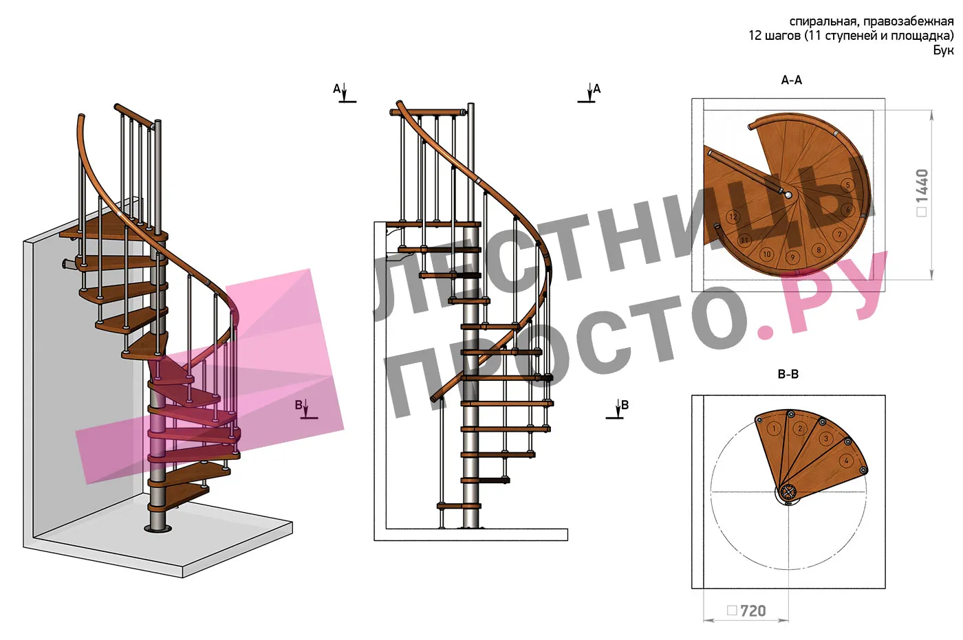 Ширина ступени между центральной колонной и поручнем ≈ 580 мм
