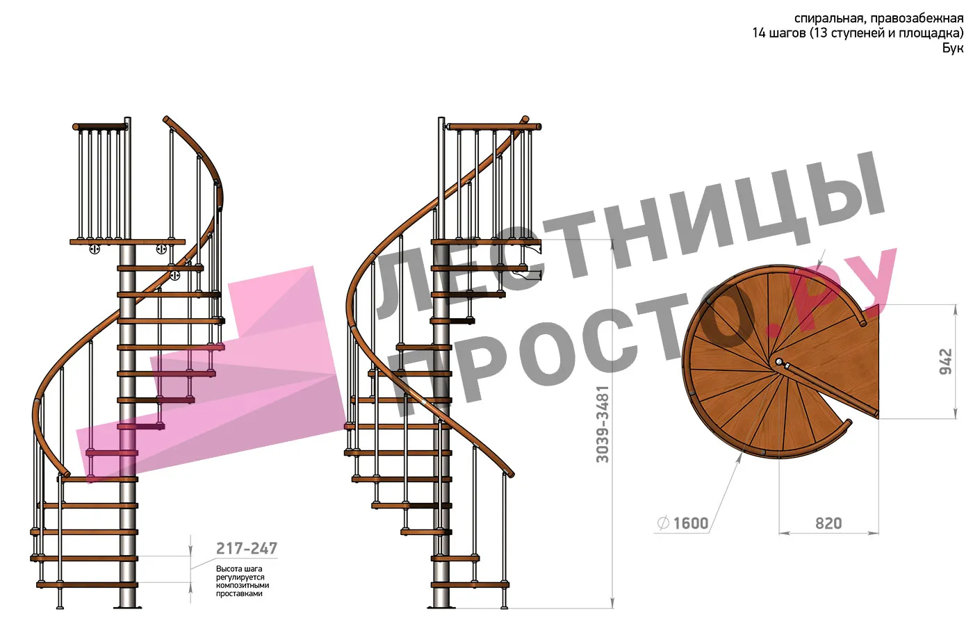 Правая, d=160см, 13 ступеней + площадка
